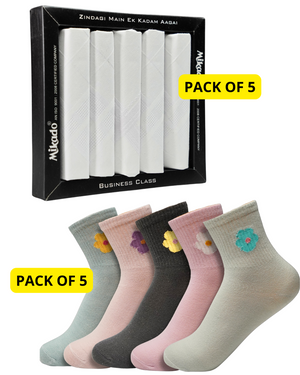 The combo contains 5 piece of white cotton handkerchief and 5 pairs of crew length socks as shown.